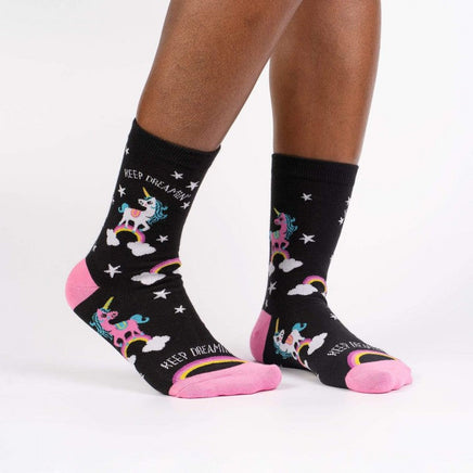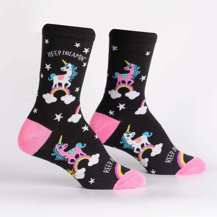 Dream big. No, bigger! Think the sky's the limit? There are unicorns and rainbows floating in space granting magical wishes to those who dare to dream hard enough. If you don't hold on to your dreams, and share them with those you care about, they might fly away, like a shooting star. Let these Keep Dreamin’ Crew Socks be a reminder of that!